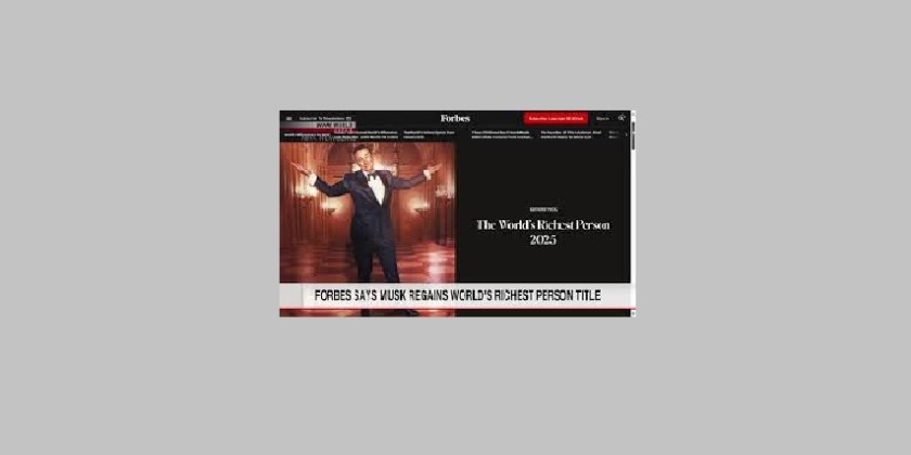 US magazine Forbes has named Elon Musk, the CEO of Tesla as the richest person on the planet. Forbes released its annual list of the world's wealthiest people on Tuesday. Musk regained the top spot for the first time in three years with an estimated net worth of 342 billion dollars. Forbes said a surge in the stock market valuations of Musk's SpaceX and xAI businesses, pushed up his assets by 147 billion dollars over the past year.