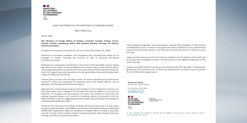 France and 14 other countries signed a “New York Call” at a United Nations conference on Tuesday, calling for recognition of the State of Palestine, French Foreign Minister Jean-Noel Barrot posted on his social media account on Wednesday.