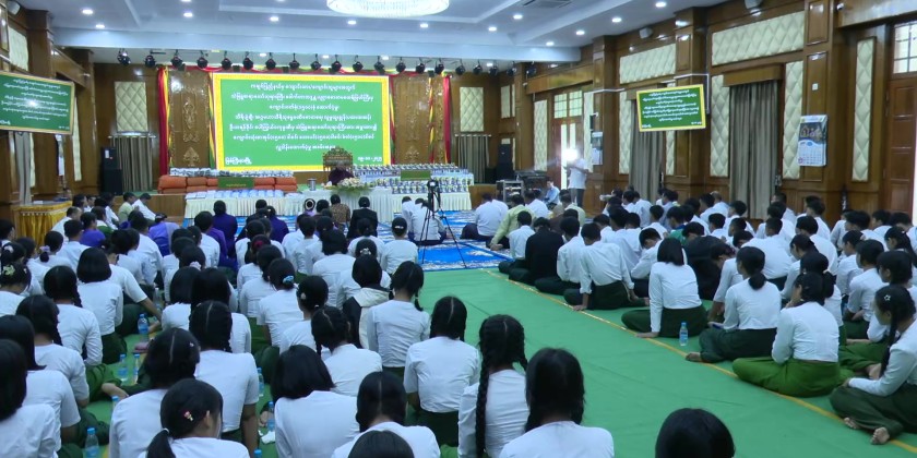 Subsequently, the Chief Minister and his wife, along with other members, attended a donation ceremony at the Maykha Hall of the Kachin State Government Office. At the ceremony, the Venerable Sayadaw donated 1,500 sets of school uniforms for students, and the well-wisher U Brang Mai donated 1,500 sets each of exercise books, pens, and pencils, under the guidance of the Venerable Sayadaw. Basic education teachers and students also attended the event and listened to the words of advice and the sermon of appreciation delivered by the Venerable Sayadaw.