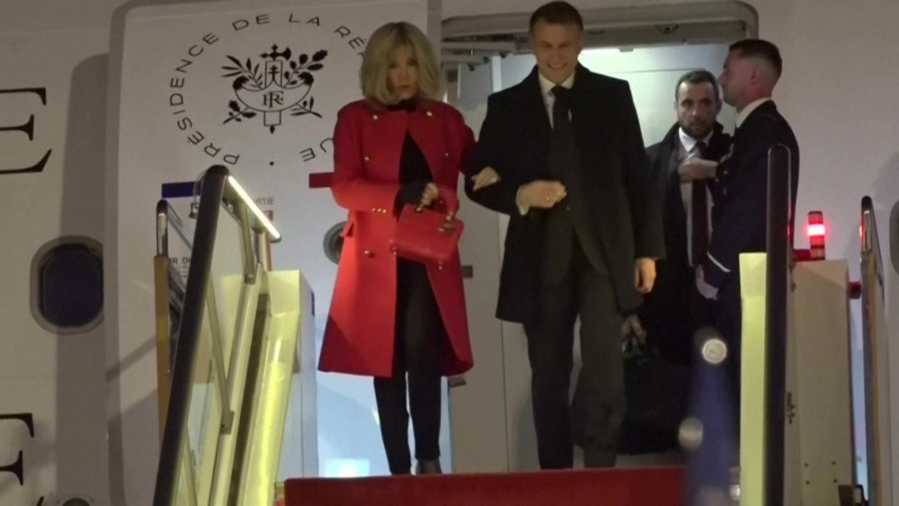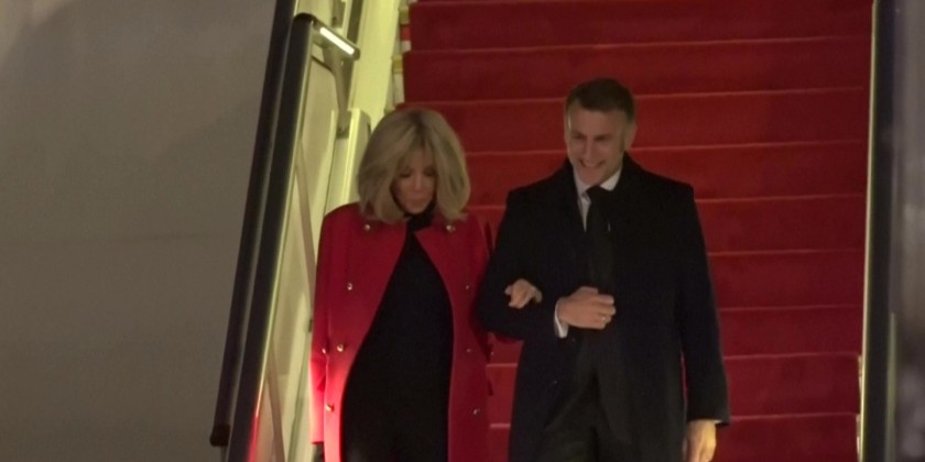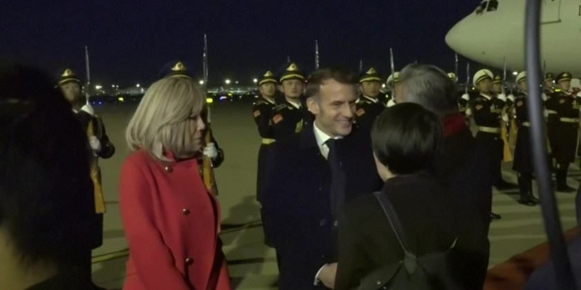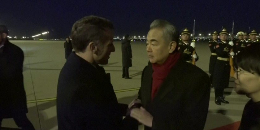 French President Emmanuel Macron arrived in China and was greeted at the Beijing airport by Chinese Foreign Minister Wang Yi. Macron is on his fourth state visit to China, where he is expected to pursue his counterpart Xi Jinping to help secure a ceasefire in Ukraine and discuss trade relations.