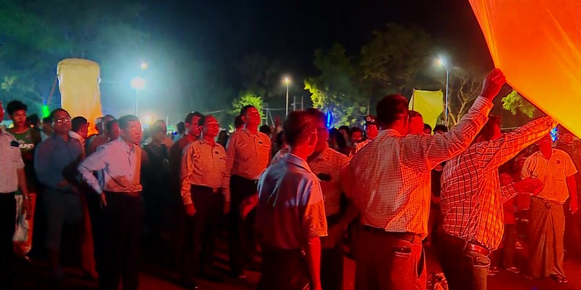 They observed the reception performances by famous singers, which were being joyfully supported by departmental staff, students from universities/degree colleges in Monywa, and residents. Together with the responsible persons, they also joyfully released 1,000 hot-air balloons within the People's Park, set off fireworks, and warmly went around greeting staff from the respective departments.