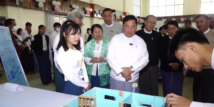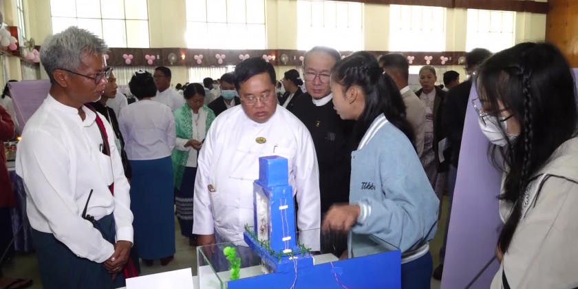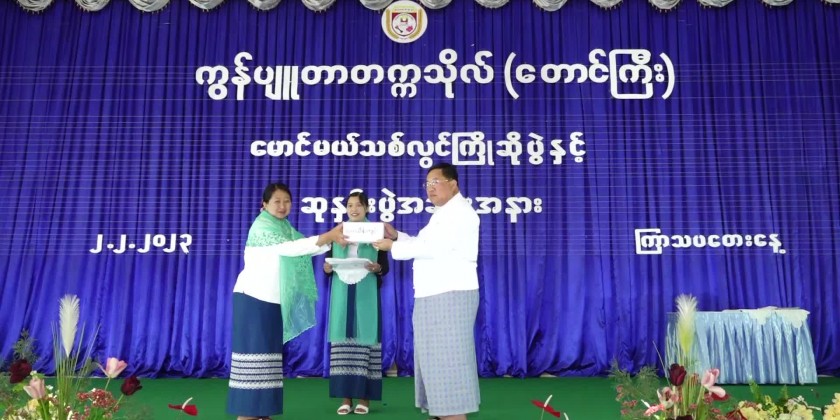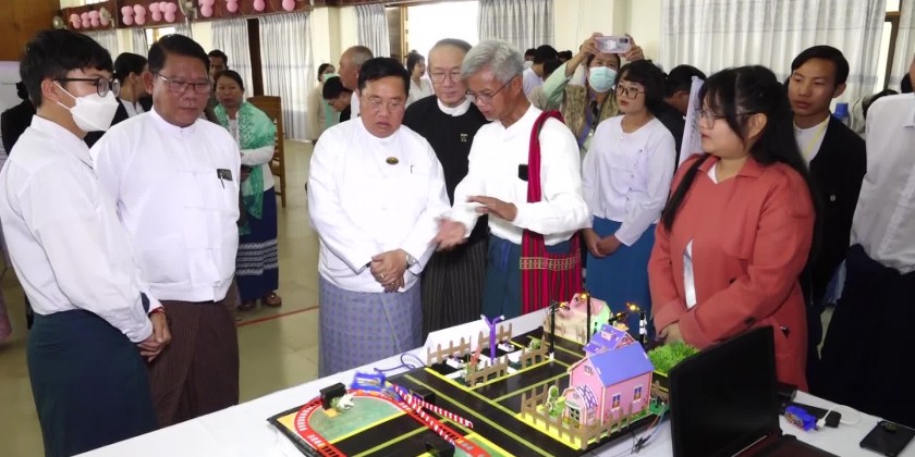 Later, SAC member Dr Kyaw Tun presented 1 million kyats cash assistance provided by the Shan State Government for the fresher welcome ceremony, prize distribution and the project show. The SAC member, the Chief Justice of the State High Court and the State Ministers presented prizes to outstanding students in the respective courses. Later, students from University for Computer Studies (Taunggyi) entertained with Shan traditional dances. The SAC member and party then viewed around the booths of project show displayed at the hall.