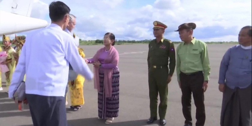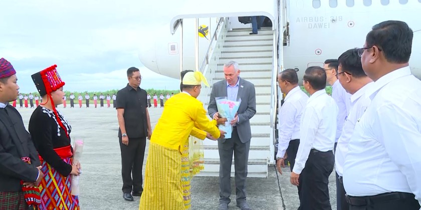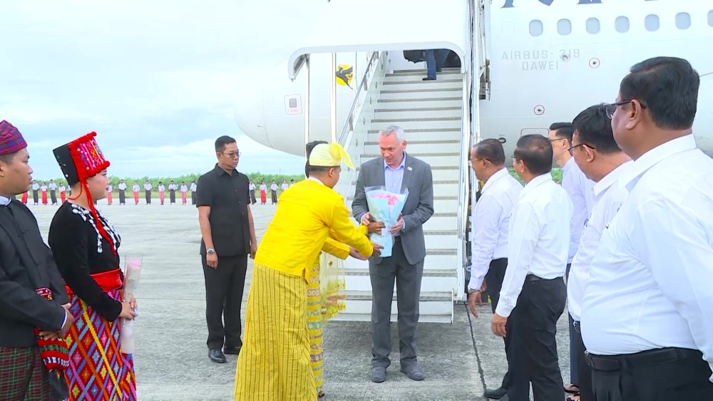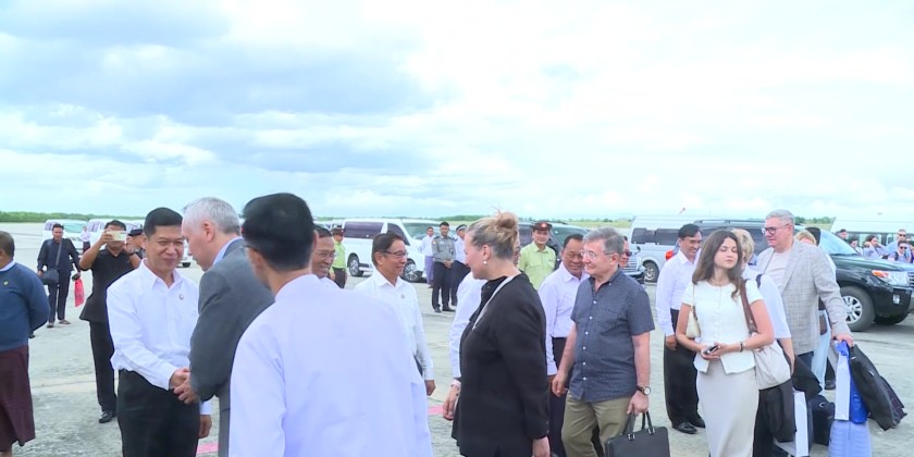 A delegation led by Mr. Andrey Travnikov, Governor of Novosibirsk Region, Russian Federation, arrived in Mandalay on Sunday. They were welcomed at Mandalay International Airport by the Mandalay Mayor, students, and officials.