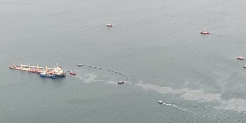 A small amount of heavy fuel oil has leaked from a bulk carrier ship which has been stranded since colliding with another ship near the Bay of Gibraltar on Monday.