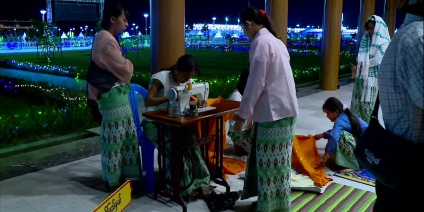The congregation later offered emerald alms bowl, fruits, flowers, water and oil lamps, and shared the merits gained. Myanmar Buddhists use to weave non-stale robes to offer to the Buddha Image during the month of Tazaungdaing.