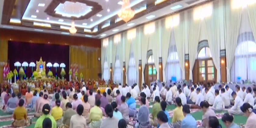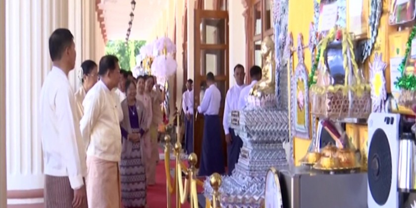 The Senior General and wife also offered an emerald rice bowl, flowers, water, light, and fruit to the Buddha Image in the Anawrahta Hall. During the donation ceremony, the Senior General and wife donated Kathina robes and offertories to the Yayzin Kan Oo Monastery Sayadaw of Nay Pyi Taw Zeyathiri Township and Patron Sayadaw of Pauk Myaing Sayadaw.