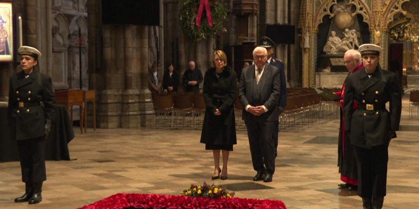 On the second day of his state visit to the United Kingdom, German President Frank-Walter Steinmeier visits the Tomb of the Unknown Warrior at London's Westminster Abbey and lays a wreath on behalf of the German people. The tomb was dedicated in 1920 with the burial of an unidentified member of Britain's armed forces who fought on the Western Front against German forces during World War I.