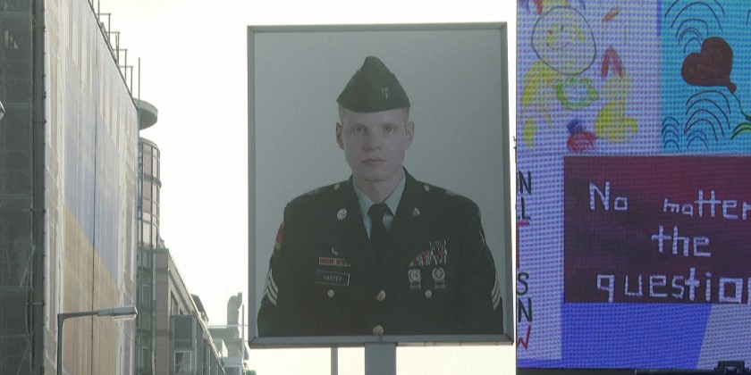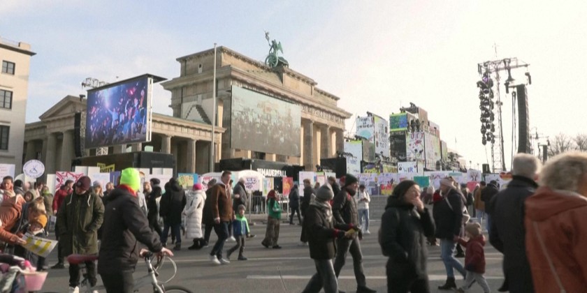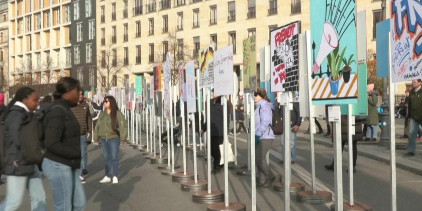 People in Berlin visit an open-air installation stretching for four kilometers along the former route of the Berlin Wall to mark 35 years since the Wall fell. The installation includes replicas of placards from the 1989 demonstrations as well as other recently created designs on the topic of 'freedom'.