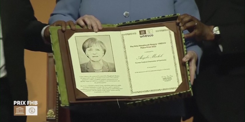 Former German Chancellor Angela Merkel received a UNESCO peace prize on Wednesday for her decision to welcome more than 1.2 million migrants to Germany despite resistance at home and among European partners.