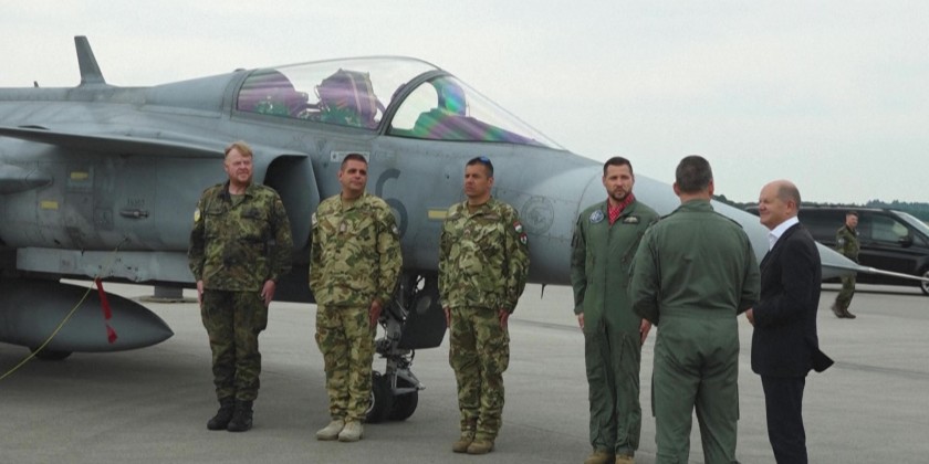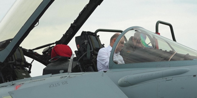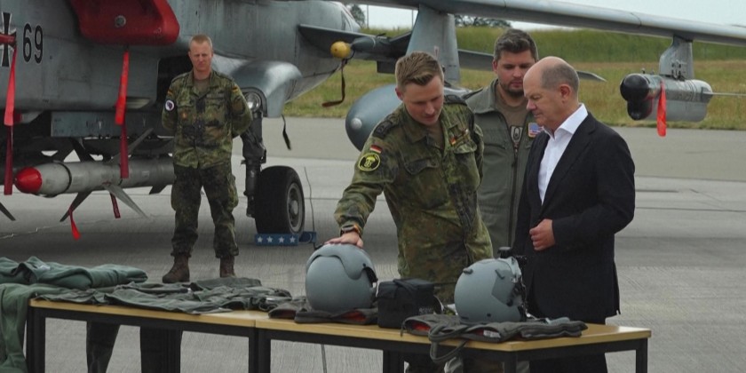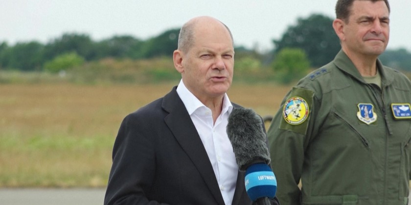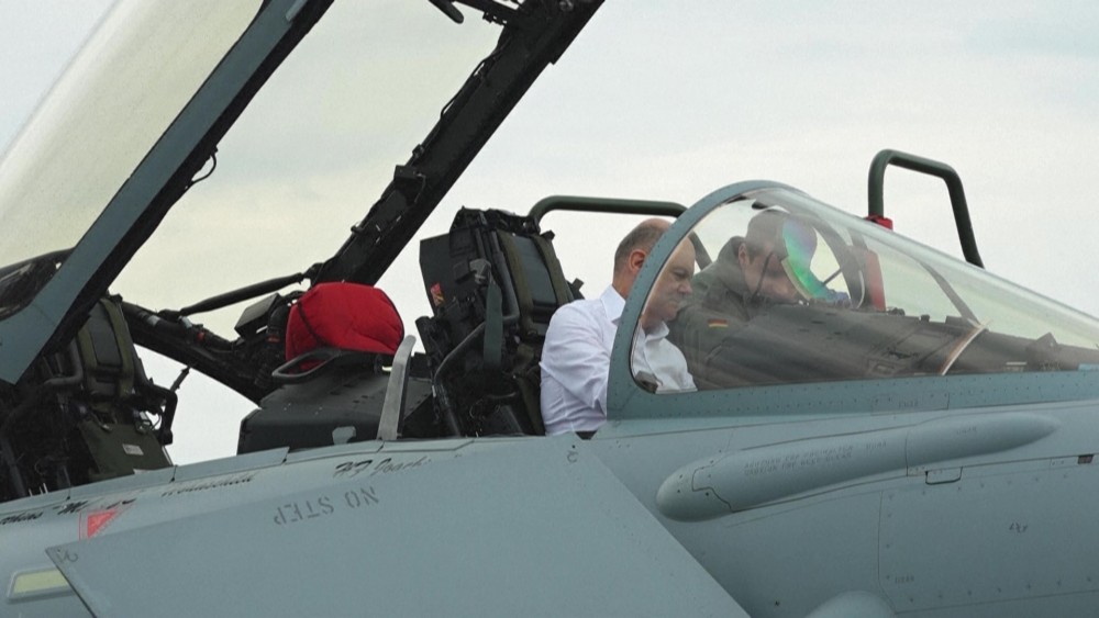 German Chancellor Olaf Scholz visits the Jagel military base in Germany, where troops and planes take part in the Air Defender 2023 exercise, a multinational air operation exercise in European airspace under the command of the German Air Force taking place from June 12 to June 24, 2023.