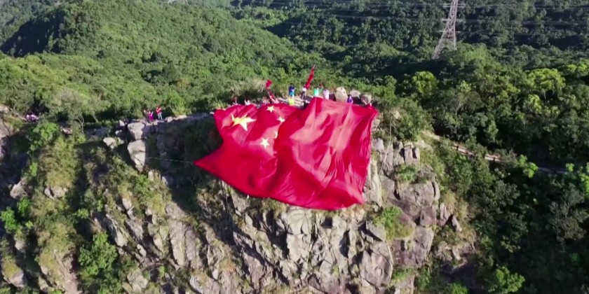 A group of Hong Kong young people hung a huge Chinese national flag at the peak of Lion Rock in Hong Kong on Sunday morning.