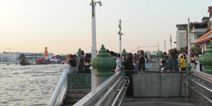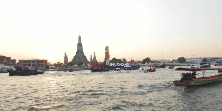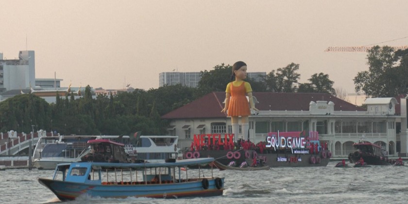 A 12-metre-tall statue of Young-hee, the iconic doll from Netflix's South Korean TV series "Squid Game" cruises on the Chao Prayer River.