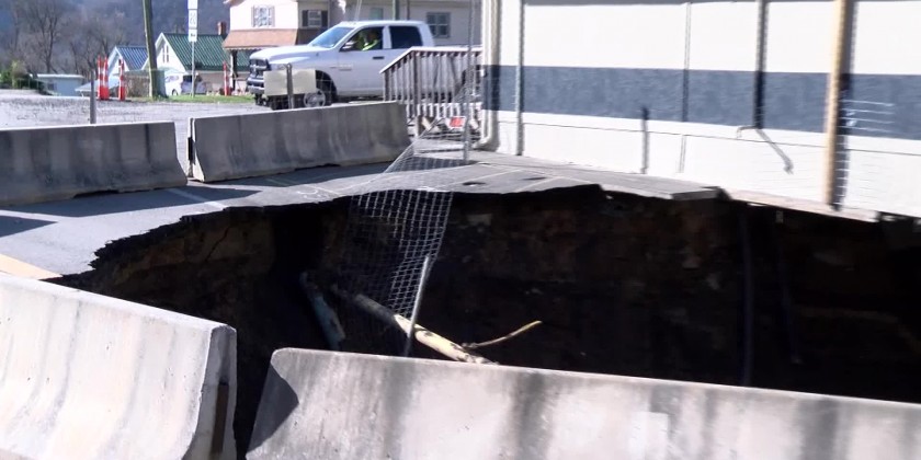 A giant sinkhole is threatening to swallow up the building that houses the police department in Hinton, West Virginia.