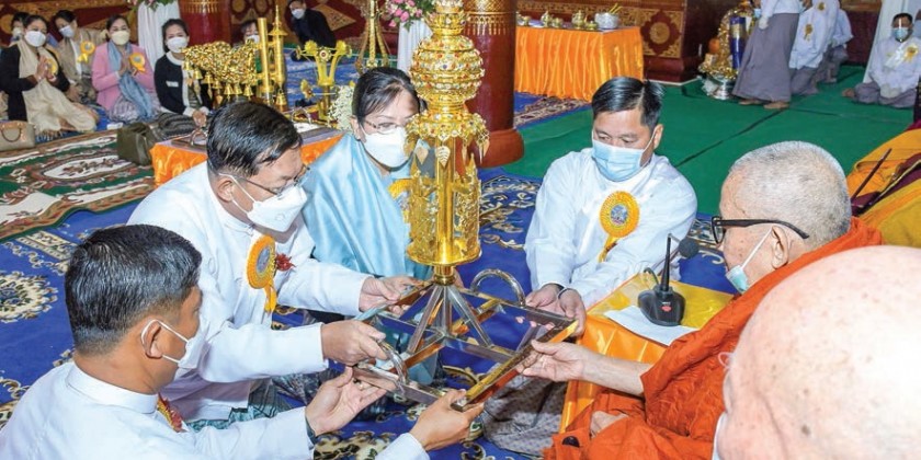 After the ritual process, the Prime Minister and wife offered diamond bud and offertories to the Keng Yun  Monastery Sayadaw while the family members offered vane, golden umbrella and offertories to Naga HnaKaung Monastery Sayadaw. SAC members and the Union Ministers also donated offertories to the members of the Sangha.