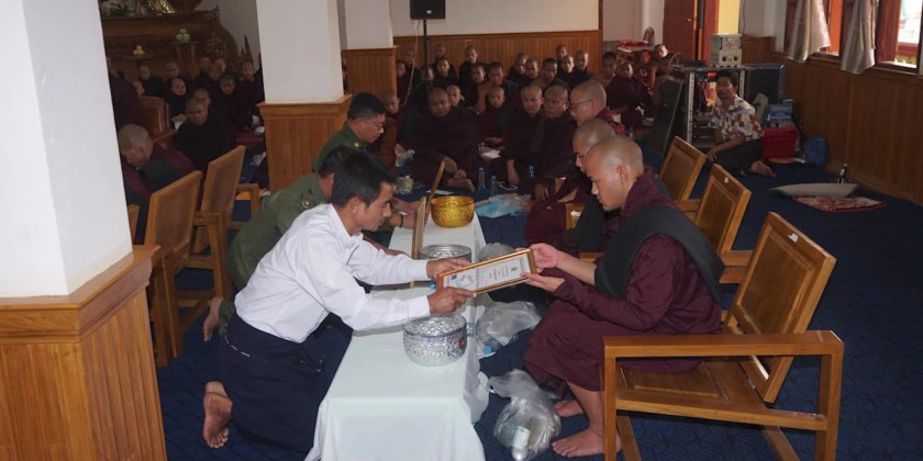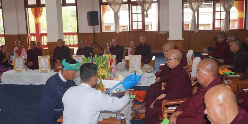 Next, the Chairman of Leading Body of Pa-O Self-Administered Zone U Khun Ye Htway supplicated religious matters. Then, Chairman of Leading Body of Pa-O Self-Administered Zone U Khun Ye Htway, Commandant of Military Computer and Technological Institute Brigadier General Thein Naing offerred the certificates of passing Pali Pahtamabyan examination and donation of cash to the 154 members of Sangha from Hopne and Hsi Hsai Townships.