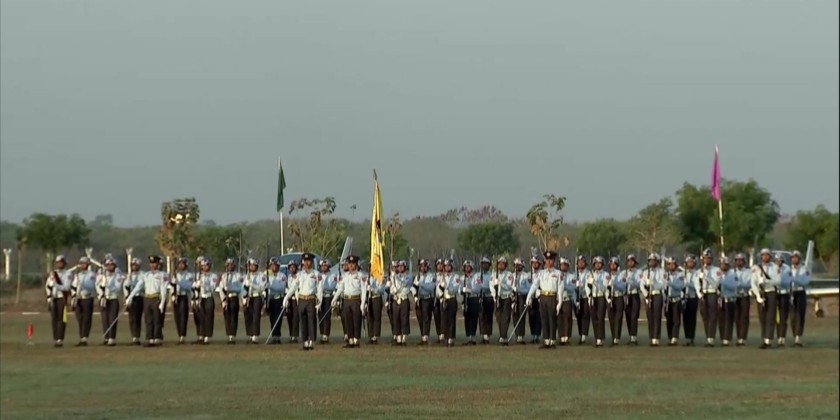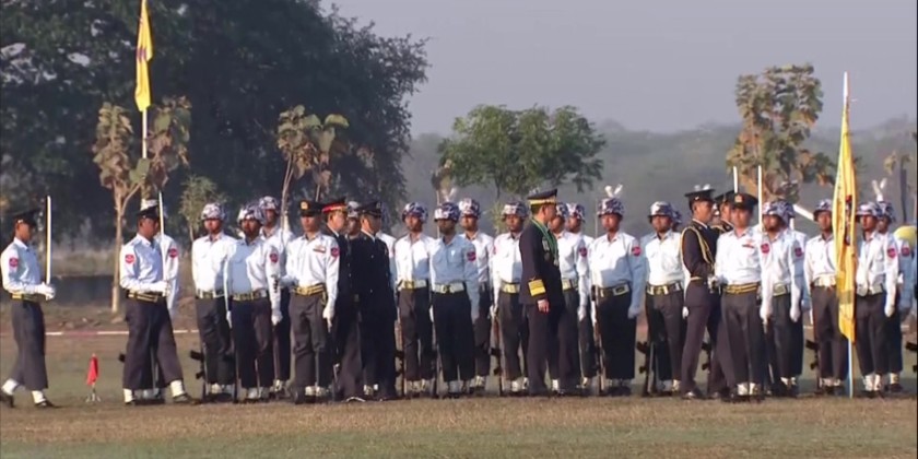General Tun Aung took the salute of the graduation company and trainee companies, and later inspected them. The graduation company and trainee companies then marched past to salute the Commander-in-Chief (Air). Meanwhile, the training aircraft flew in formation as a salute.