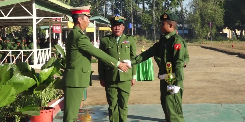 Firstly, Commander of No.9 Military Operations Command Colonel Aung Aung Hein inspected parade column and presented awards to the outstanding trainees. Then, the parade column saluted the commander and left the parade ground.