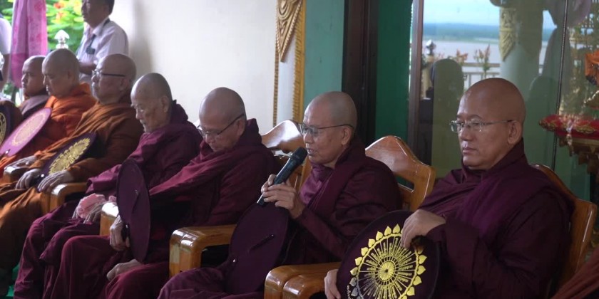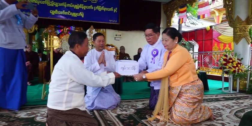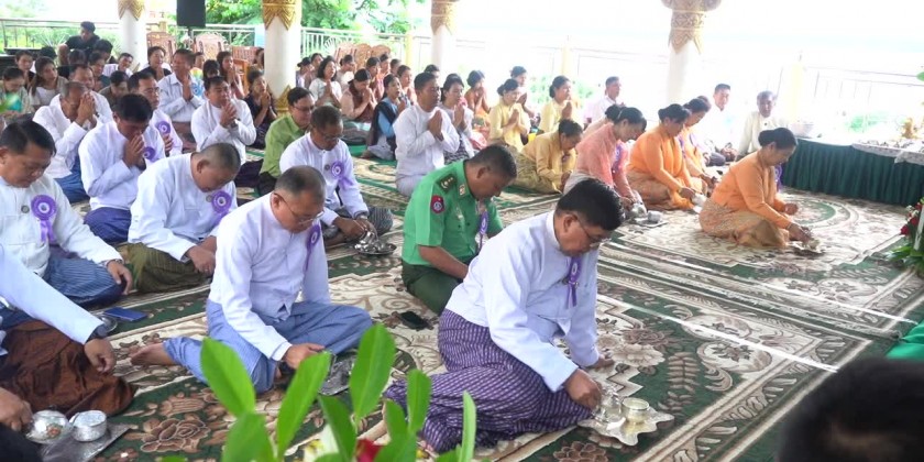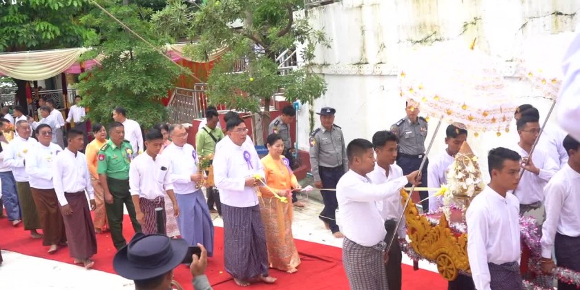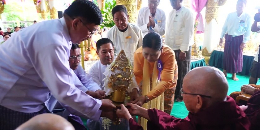 First, the congregation led by the Region Chief Minister Thiri-Pyanchi U Tint Lwin observed eight precepts, took the Paritta Suttas recited by the members of Sangha, offered diamond bud and pennant-shaped bane to the members of Sangha and joined the procession of diamond bud, pennant-shaped bane and other religious objects in clockwise direction on the pagoda platform.