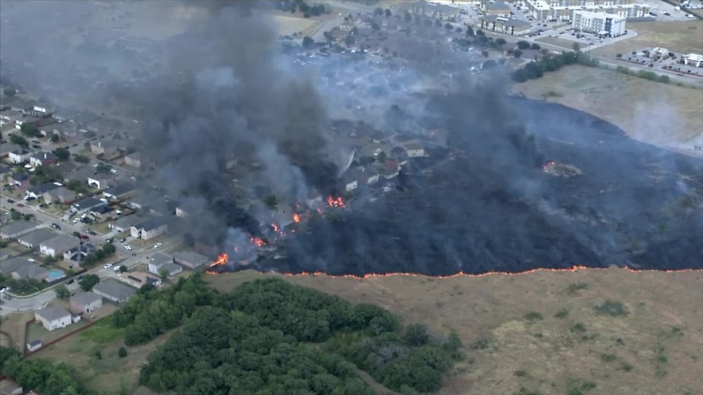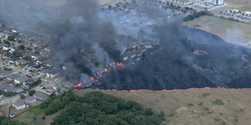 A grass fire apparently sparked by a mower swept about 300 yards across a tinder-dry open field to a suburban Dallas subdivision Monday, burning through wooden fences and torching as many as 20 homes, officials said. The blaze in Balch Springs was the latest in drought-stricken North Texas, which has been vulnerable to explosive wildfires for at least two weeks.