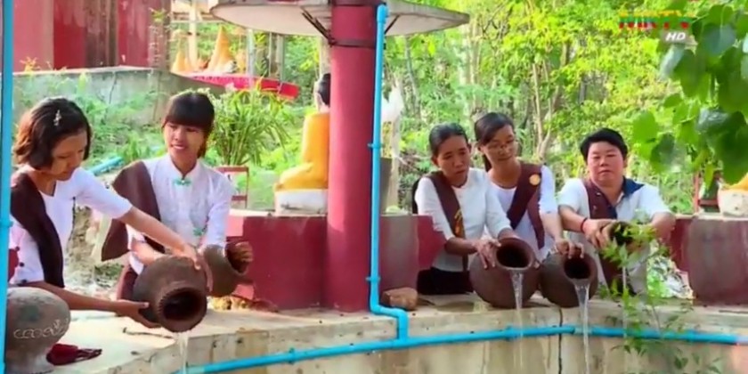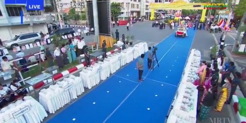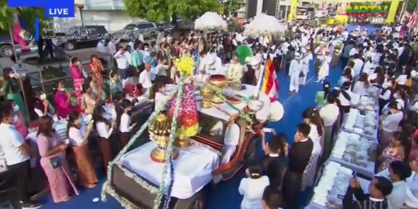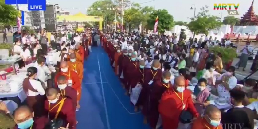In commemoration of the 2566th anniversary of the Buddha Sasana, the ceremony of offering alms-foods, offertories and cash donation to the 10264 members of Sangha residing in four quarters of Mandalay City was held by the well wishers led by the Mandalay Region Government at 6 a.m. on the Buddha Day which falls on 14th May (the full moon day of Kasone) at platforms of four cardinal moats of the Mandalay Palace. At each platform of four moats, the alms-foods, offertories and cash donation were offered to a total of 2566 members of Sangha.