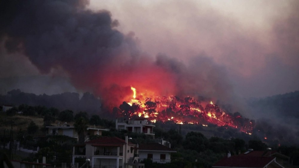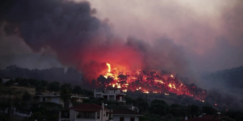 Greek firefighters continued to battle into the night to control a large forest fire fanned by strong winds close to homes near the seaside village of Kechries in the eastern Peloponnese on Wednesday. Authorities said they had been forced to evacuate a residential settlement as the blaze came close to a military camp where explosives were stored.