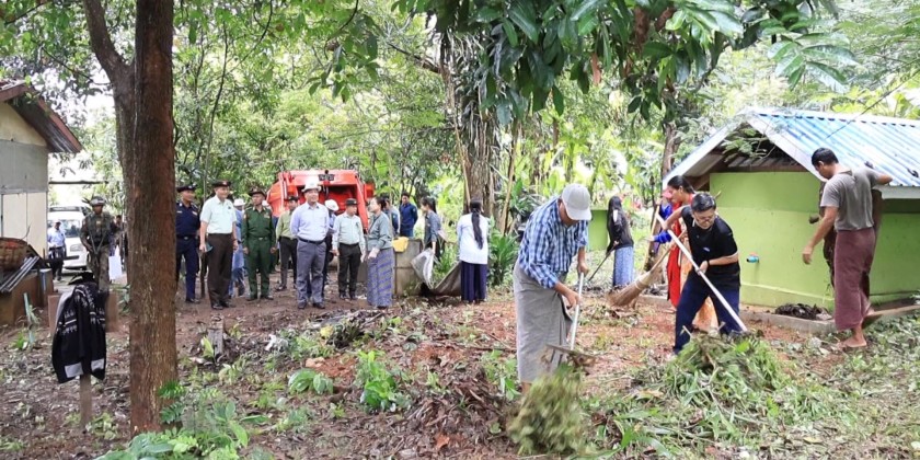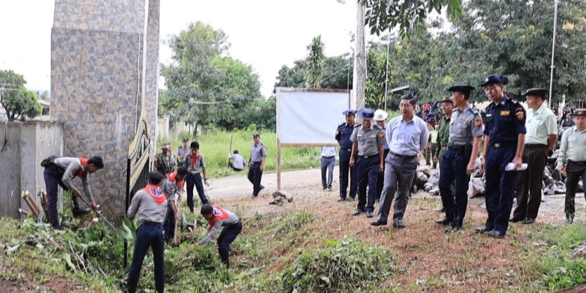 They observed joint cleaning efforts carried out by members of the Myanmar Police Force, local battalions, Fire Brigade members, departmental staff, and local residents at the training school’s compound. During the inspection, the Chief Minister warmly greeted the participating volunteers, for their contributions.
