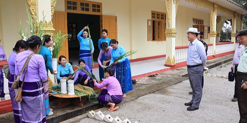 The Chief Minister and party then oversaw the renovation works at Ayechan Aungmyin Pagoda, including gold foil offering, the bell tower, inscription stone pillars, and platform painting. They also reviewed the concrete paving at the Saddhamma Jotika Dhaja Ordination Hall. The Chief Minister called for timely and quality completion of the projects.