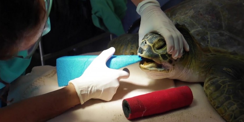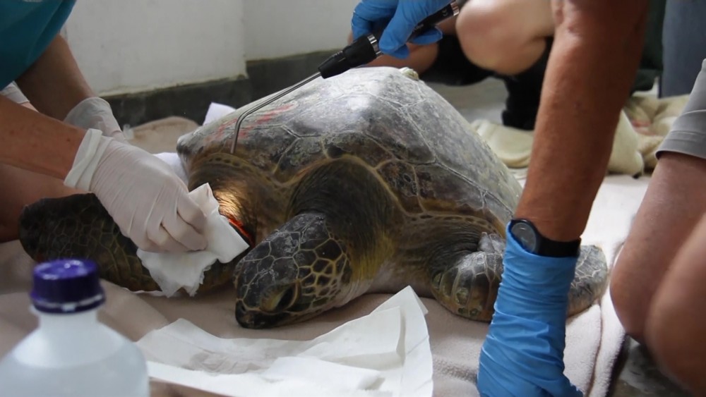 The Taronga Veterinary team treated the wounds and attempted to retrieve the fish hook but were not successful. Despite this, the turtle appeared to be able to move freely and was largely unaffected by the hook.