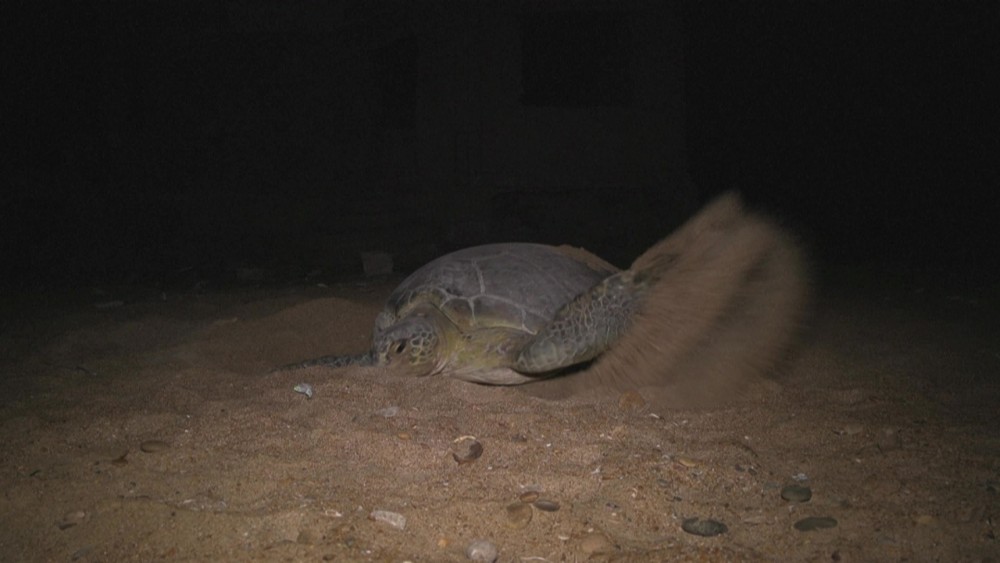 One trundles towards the end of the beach bank, its flippers whipping sand into the air before settling on a dry spot of sand in which to deposit 88 golf ball-sized eggs.