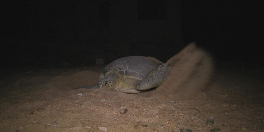 Against the backdrop of the mega port city of Karachi in Pakistan, four green turtles emerge from the frothy Arabian Sea seeking a spot to lay their eggs.