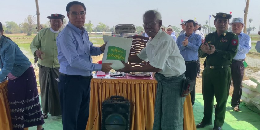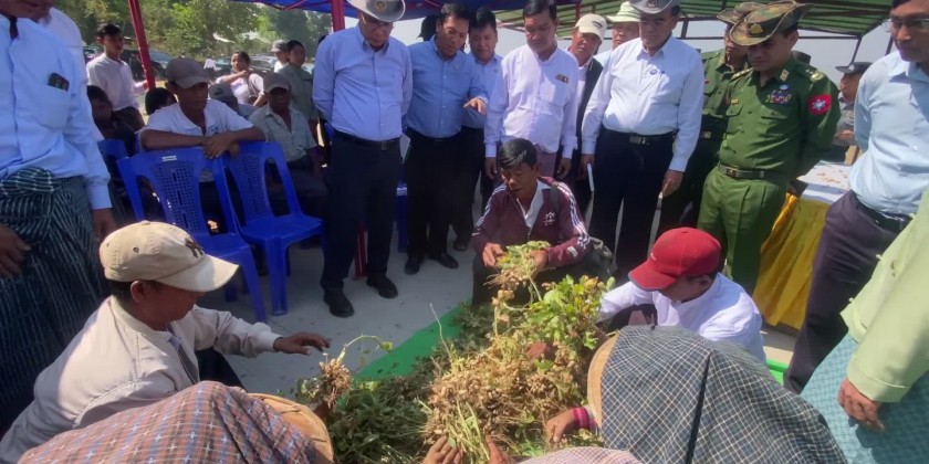 Then, the Chief minister and party viewed the harvesting groundnut model field in TaungBwe Village in Pan Taung Township, irrigation by Thuyetan Electric water pumping system, provided agricultural inputs, inspected laying concrete road at the entrance of the Village.