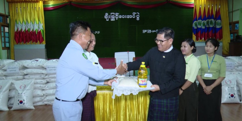 On the 18th December, the Chief Minister attended the foodstuff provision ceremony at the Myitkyina Township joint-office, provided rice bags, edible oil and cash assistance to the stuff from Bamhaw District and expressed words of encouragement.