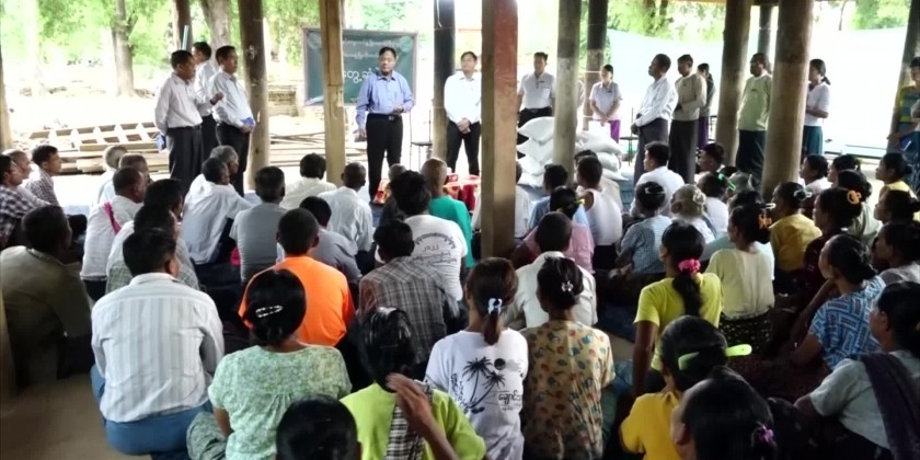 At the Nyaung Kaing Village of Tatkone Township, the Union Minister met with the flood affected people and gave words of encouragement and necessary instruction and provided rice to the flood affected people of the Village.