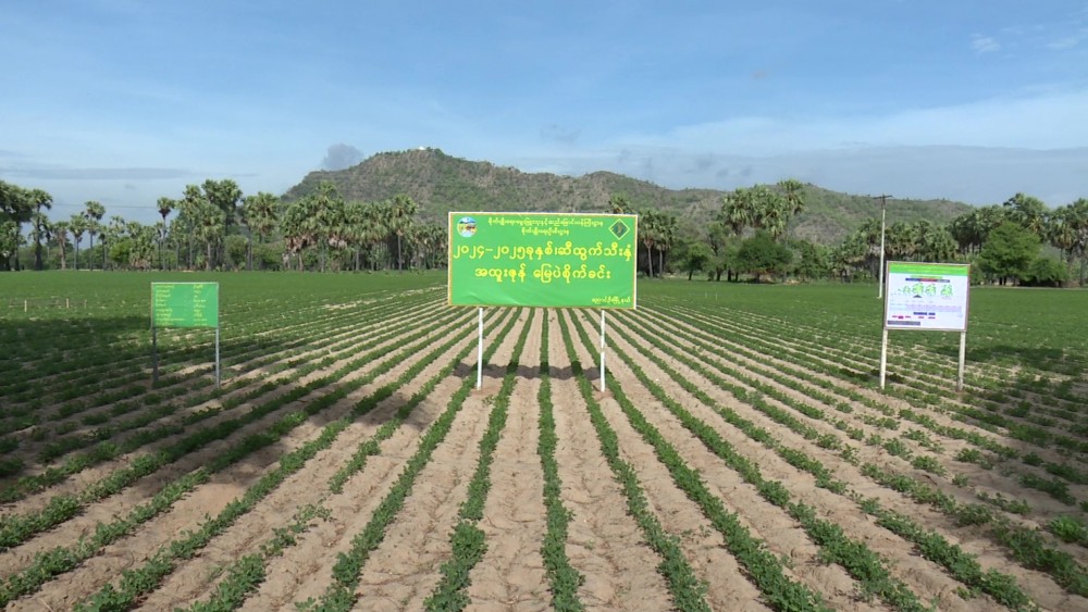 The Deputy Minister for Agriculture, Livestock and Irrigation Dr. Tin Htut made a ground inspection tour to the groundnut plantation planted with tractor-held seeder innovated by Nyung-U Township at the Special Oil Crop Zone on 5th July.
