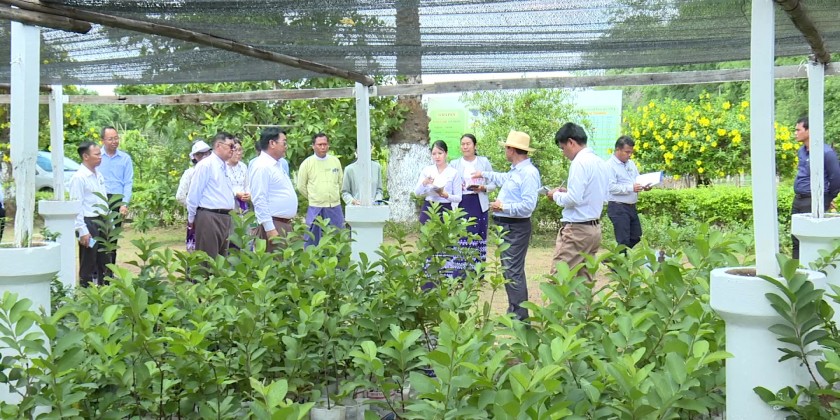 Next, the Deputy Minister inspected the Hsal-Pauk farm and the farm In-Charge clarified the plantation of mango, grapes and guava and the plan to grow the new crops suitable to the local land condition and climate.