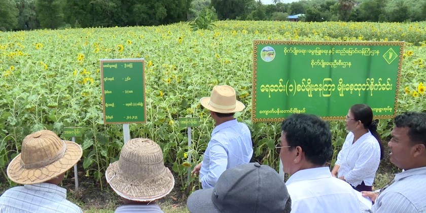 After that, the Deputy Minister inspected sunflower seed producing plantation thriving at the plot of farmer U Thar Au in Kaing Village of KyaukBaDaung Township and shared the knowledge on the purifying seeds and yielding to meet the target.