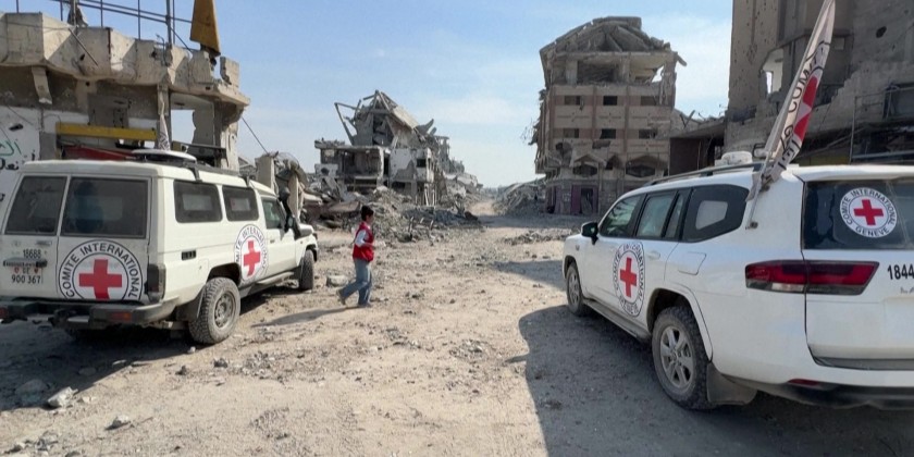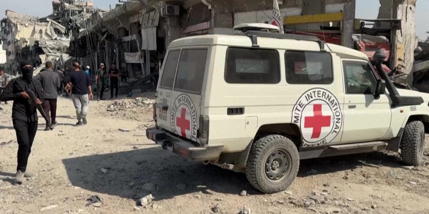 Armed Hamas militants and Red Cross vehicles in the Shejaiya district of eastern Gaza City wait for authorisation to go beyond the so-called Yellow Line, the boundary behind which Israeli troops pulled back and remain stationed under the ceasefire agreement with Hamas.