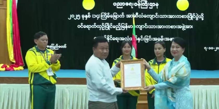 Deputy Minister U Nay Myo Hlaing also presented a honorary certificate to a responsible official from the Department of Sports and Physical Education. Afterward, the athletes group received necessary sports equipment and 2 million honory kyat award from Myanmar Track and Field Federation and Myanmar Sepak Takraw Federation.