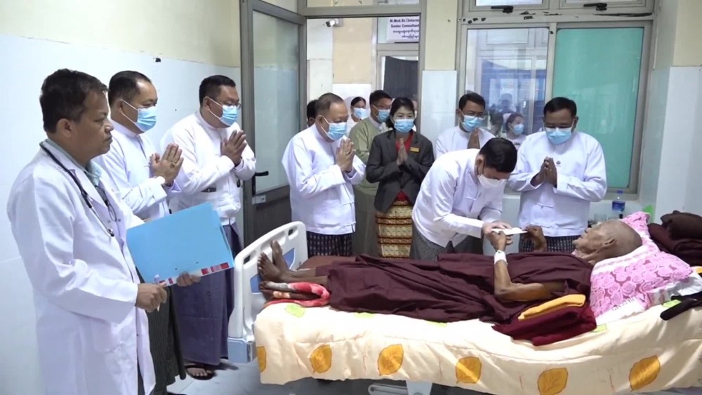 Rakhine State Chief Minister U Htein Lin accompanied by state government members and departmental officials paid respect to the Thet Taw Shay NgaSaingYaingChaung Sayadaw receiving medical treatment at the 500-bed hospital in Sittwe Township on Wednesday morning and donated offertories and nutritious food.