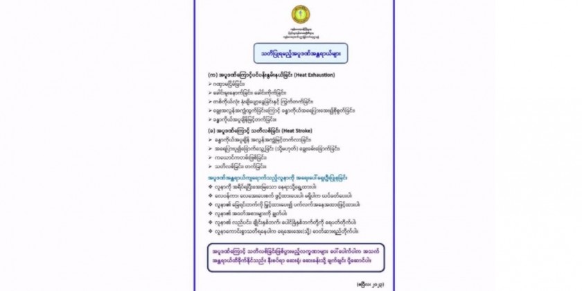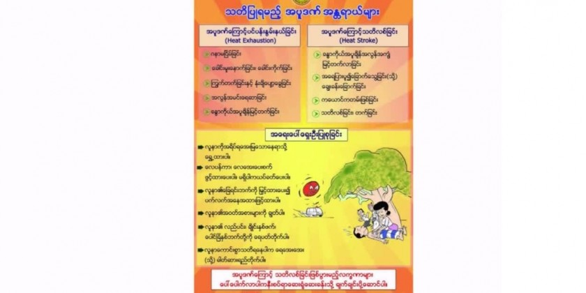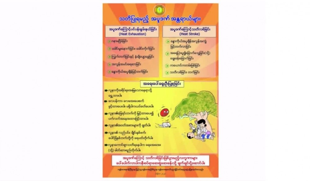 Director, Department of Public Health (MOH), Dr.Than Naing Soe said “As the weather heats up, extreme heat can impact our health in many ways such as - losing water and minerals from our bodies, overload of works for heart and blood vessels, the appearance of itchy rashes on the skin, fatigue due to heat waves, dizziness, headaches, dry sweat and high body temperature and finally it can happen unconsciousness and be life threatening.The people with underlying diseases, the elderly persons and children and those who are working in the sun in daytime need to take care of their health more than others and they need to rest under shady places.”