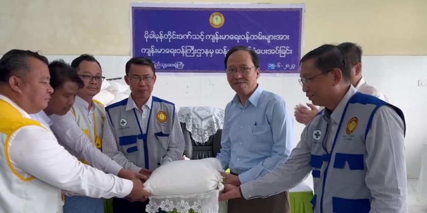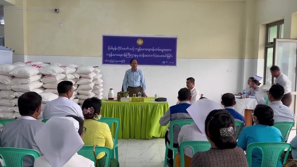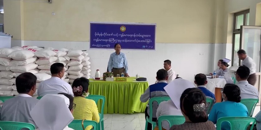 Union Minister for Health Dr. Thet Khaing Win who is currently in Sittwe of Rakhine State together with officials attended a ceremony to provide rice to health staff at the Sittwe General Hospital on 15th June.