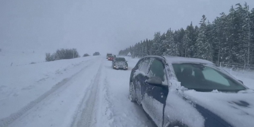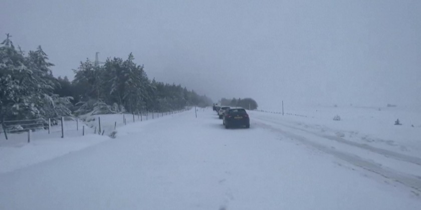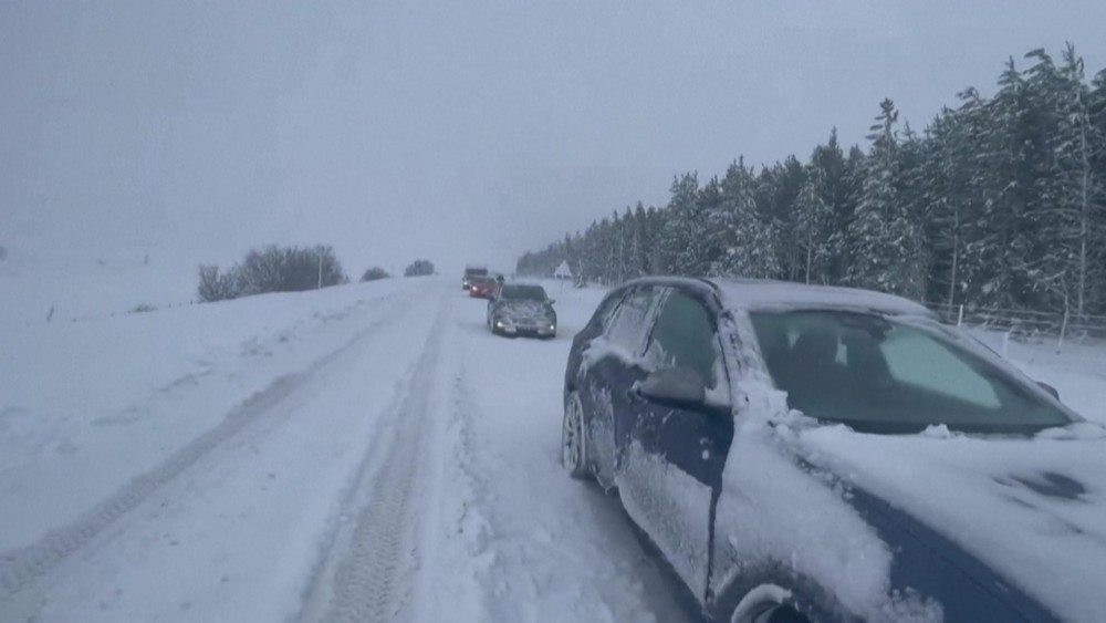 Heavy snowfall caused by Storm Gerrit halted traffic on the main road of the A9 in the Scottish Highlands near the village of Dalwhinnie.