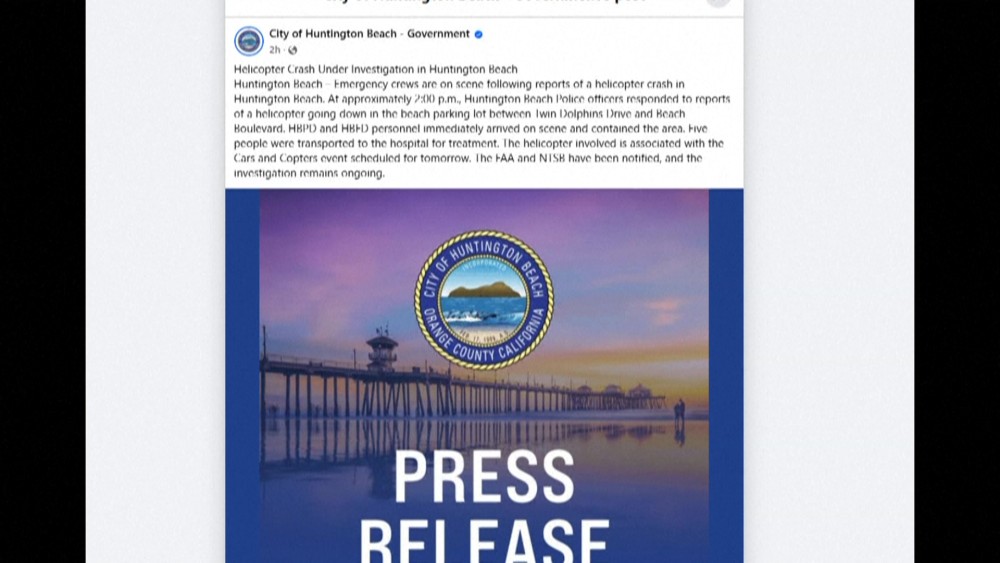 Five people, including a child, were hospitalized when a helicopter crashed in the Southern California city of Huntington Beach on Saturday afternoon. Police began to investigate the crash. They asked people to avoid the area and use alternate routes for at least several hours after the closure was put into place. It's unclear what caused the helicopter to crash.