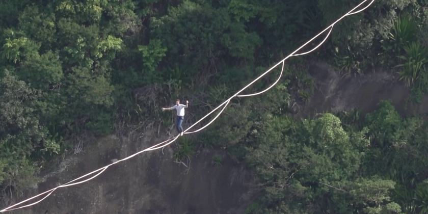 The stunt was part of a project called "Les Traceurs", where he crosses long distances next to famous global landmarks in order to draw awareness to environmental issues. Slacklining is similar to tight rope walking but uses a different material and the tension on the line is less.