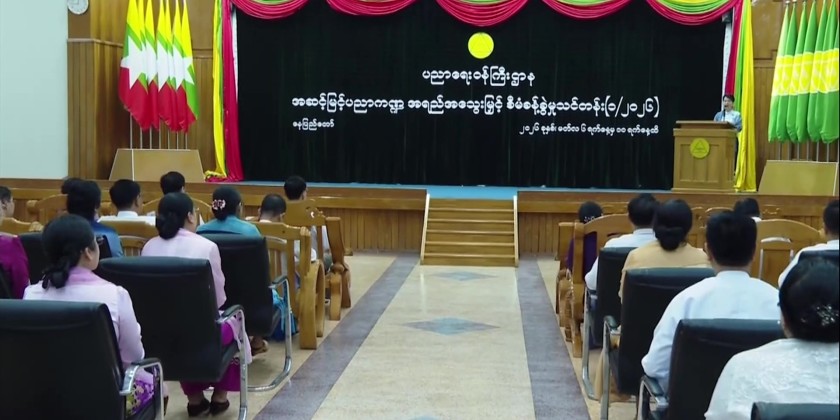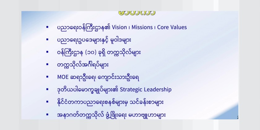 First, Union Minister for Education Dr. Chaw Chaw Sein delivered the opening address and guidance for the training course. She stated that among the many applicants for the vacant Pro-Rector positions in universities, selections were made through a multi-stage screening process. The selection was based on age criteria and professorial tenure, involving written examinations and evaluations through presentations divided into two groups.