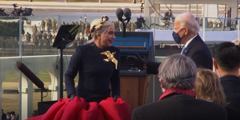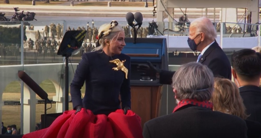 A full-throated, supremely confident Lady Gaga belted out the national anthem at President Joe Biden's inauguration in a very Gaga way — with flamboyance, fashion and passion. The Grammy winner wore a large dove pin and an impressively billowing red sculpted skirt as she sang into a golden microphone, delivering an emotional and powerful rendition of "The Star-Spangled Banner."