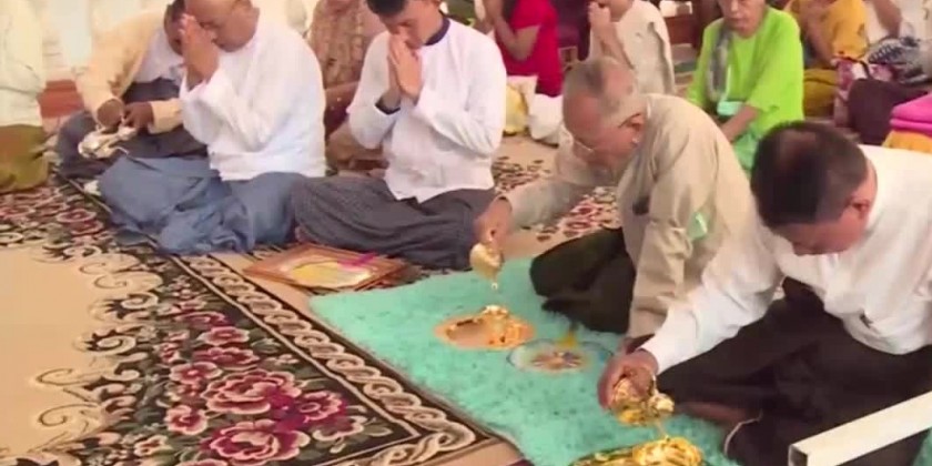 Presiding Sayadaw, Dagon Pariyatti Sarthintaik, Baddanta Mæmakæbhivaµsa, said " As a saying of Lord Buddha relating with performing meritorious deeds, the one doing with triple gems is the most valuable. So, through paying homage and offering to these triple gems, may you all be able to perform the good deeds possessing physical and mental well-being and to be able to reach Nibban, it is now to share the merits gained to all beings seen or unseen in all existences through a libation."