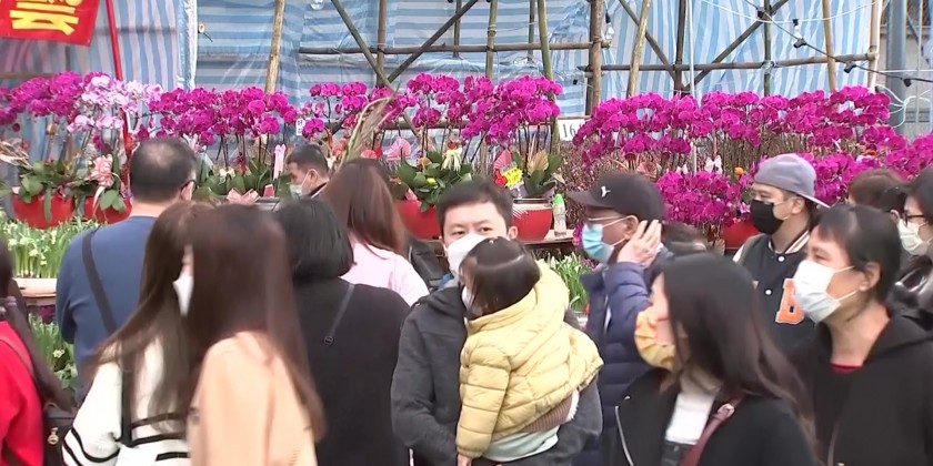 Hong Kong still has a mask mandate and local authorities remain cautious about coronavirus control measures. There are far fewer people at the flower market on the eve of the Year of the Rabbit compared to celebrations in 2020.