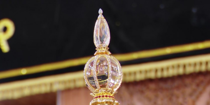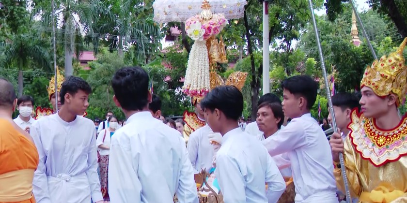 The congregation firstly conveyed the diamond-bud and vane to be hoisted atop the ancient historical teak monastic building with the ceremonial celestial guard and royal guard from the temporary sojourn of San Mai Vihara monastic building to Shwe Kyin Sangharaja Beikman as per the plans.
