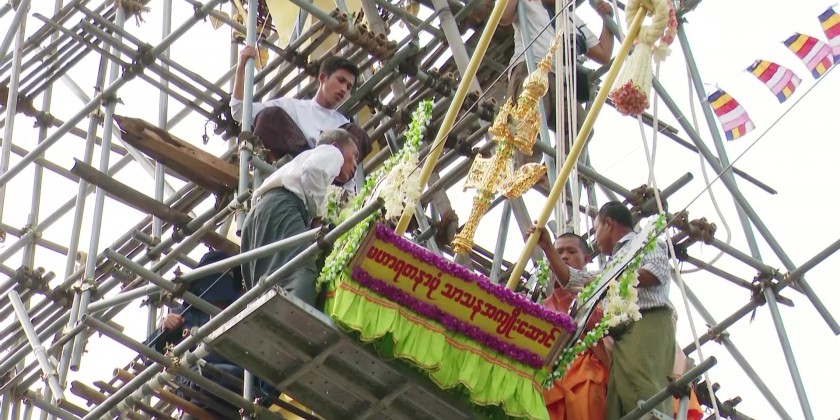 A grand ceremony of hoisting diamond-bud and vane atop the ancient historical teak monastic building in the compound of Maha Dhammikarama Shwe Kyin Monastery which was the donation of King Mindon was held on Sunday morning.